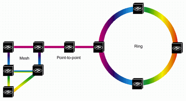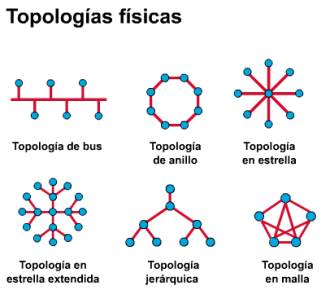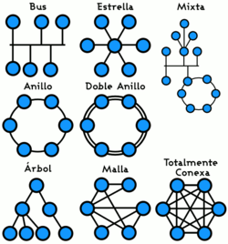 Las topologías más corrientes para organizar las computadoras de una red son las de punto a punto, de bus, en estrella y en anillo. La topología de punta a punta es la más sencilla, y está formada por dos ordenadores conectados entre sí. La topología de bus consta de una única conexión a la que están unidos varios ordenadores. Todas las computadoras unidas a esta conexión única reciben todas las señales transmitidas por cualquier computadora conectada. La topología en estrella conecta varios ordenadores con un elemento dispositivo central llamado hub. El hub puede ser pasivo y transmitir cualquier entrada recibida a todos los ordenadores —de forma semejante a la topología de bus— o ser activo, en cuyo caso envía selectivamente las entradas a ordenadores de destino determinados. La topología en anillo utiliza conexiones múltiples para formar un círculo de computadoras. Cada conexión transporta información en un único sentido. La información avanza por el anillo de forma secuencial desde su origen hasta su destino.